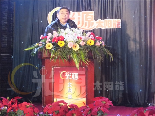 首先,12月6日上午9:30,光源年會隆重開幕。在年會上,中國太陽能熱利用產業聯盟副理事長、中國太陽能熱利用產業協會副理事長、河北光源太陽能科技有限公司董事長李成彬致辭。他代表光源公司對各位領導、專家、經銷商朋友的到來表示熱烈歡迎和衷心感謝,對光源2014年取得的成績和2015年發展方向進行了總結和展望。李成彬指出,2014年是光源發展史上不平凡的一年,在國內經濟增速放緩的大背景下,太陽能光熱行業也受到極大影響。但光源勇敢拼搏、堅定信念,以市場為導向,以銷售為龍頭,產量雖然相比去年有所下滑,然而,我們依然對太陽能光熱行業的發展前景充滿信心,相信太陽能光熱的春天一定還會到來。行業領導羅振濤、霍志臣、張曉黎、賈鐵鷹、楊桂元先后講話。在講話中,領導們肯定了光源跨越發展、科技創新取得的喜人成績,肯定了光源在全國同行業中的地位和作用,對光源未來發展提出了指導性意見。光源公司總經理劉迎波在講話中詳細分析了光源公司面對的市場形勢,他說,光源公司在今后的發展道路上要審時度勢,及時調整經營戰略和營銷政策,做精做細終端市場,和廣大經銷商一起,打造符合光源特點的企業發展之路。