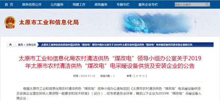 原市工業和信息化局農村清潔供熱“煤改電”領導小組辦公室關于2019年太原市農村清潔供熱“煤改電”電采暖設備供貨及安裝企業的公告