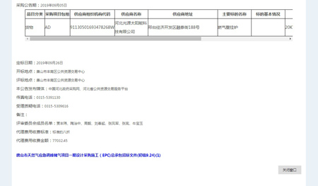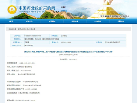 奮力拼搏創佳績,捷報頻傳奏凱歌。河北光源太陽能科技有限公司,在2019年09月27日,唐山市豐南區2019年第二批氣代煤燃氣壁掛爐及電代煤電取暖設備采購及安裝項目A標包第四標段中標,為我公司2019年度輝煌的經營業績再添濃墨重彩的一筆。