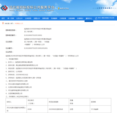 2020年,一場突如其來的疫情席卷全國,蔓延全球。隔離疫情不隔離服務(wù),在此特殊時期,光源公司積極踐行企業(yè)社會責(zé)任,保障復(fù)工復(fù)產(chǎn)的同時統(tǒng)籌疫情防控,嚴(yán)防死守全面做好疫情防控工作,科學(xué)有序復(fù)工復(fù)產(chǎn)。全體光源人振奮精神,團結(jié)協(xié)作,高效率、高質(zhì)量投入復(fù)工后的公開投標(biāo)項目,憑借三十余年行業(yè)經(jīng)驗和口口相傳的業(yè)界優(yōu)良口碑,以及雄厚的綜合實力,持續(xù)為客戶提供優(yōu)質(zhì)的產(chǎn)品和專業(yè)的售后服務(wù)。河北光源太陽能科技有限公司,中標(biāo)臨西縣2020年農(nóng)村地區(qū)冬季清潔取暖項目(電代煤)(第一標(biāo)段:“太陽能+電輔助”)。