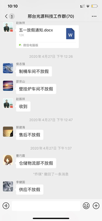 .”前的427日,光源太陽能科技公司下發了“五.一”放假的通知。通知說:“經公司領導研究決定,自202051日——202055日(“五.一”國際勞動節)放假五天。”