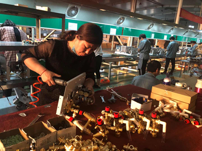 壁掛爐車間,兩條流水線上,工人們干的歡。他們的口號是:“奮斗在肩,奮斗有我!”