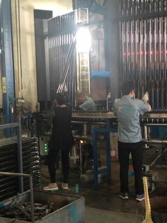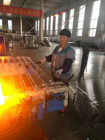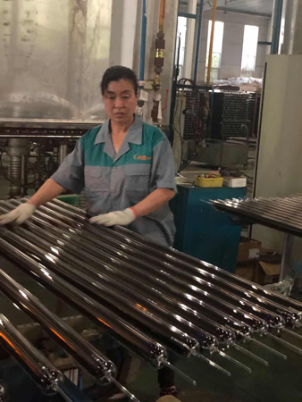 “五.一”這天,驕陽似火。室外溫度高達35度,真空管車間,在火考中作業,工人們揮汗如雨戰高溫。他們的口號叫得響:寧流萬滴汗,不出一次品。
