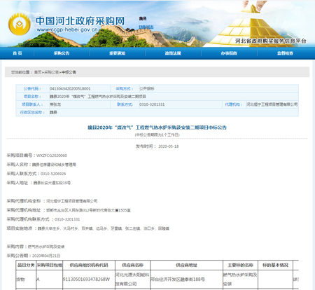 魏縣2020年“煤改氣”工程燃氣熱水爐采購及安裝二期項目